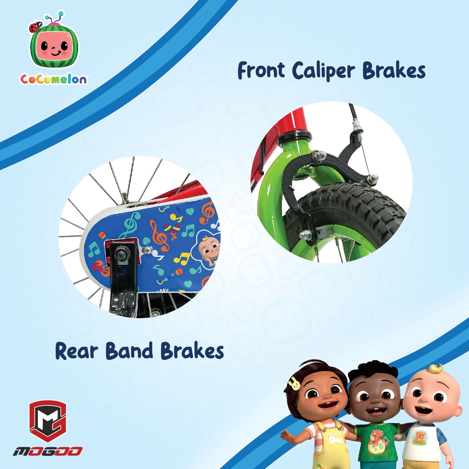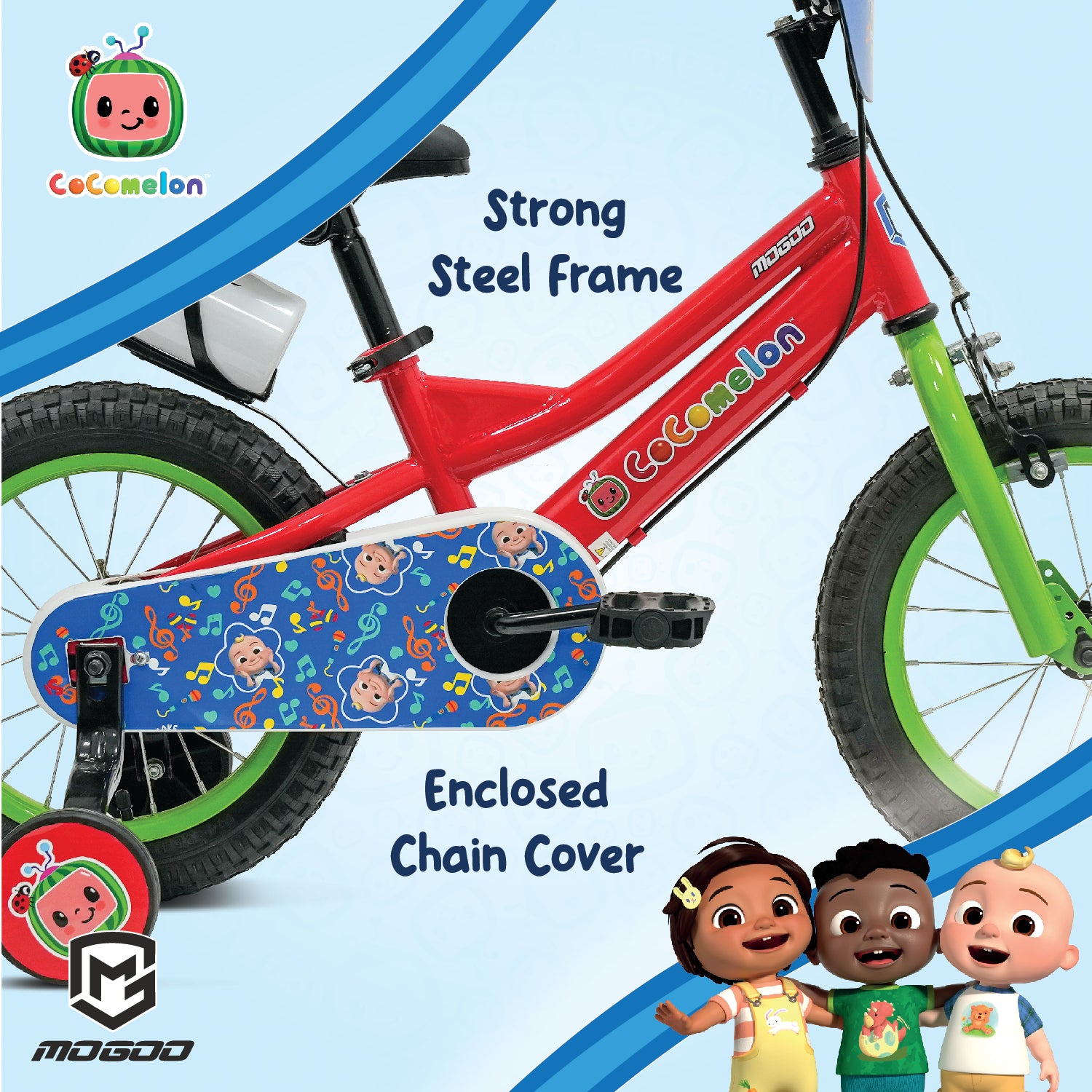 The Mogoo Cocomelon Beats Kids Bicycle is the perfect ride for young adventurers, blending fun Cocomelon-themed graphics with reliable safety features. Available in 12-inch and 14-inch sizes, this bike is designed to grow with your child. Constructed with a durable steel frame, it offers a stable and safe riding experience.
