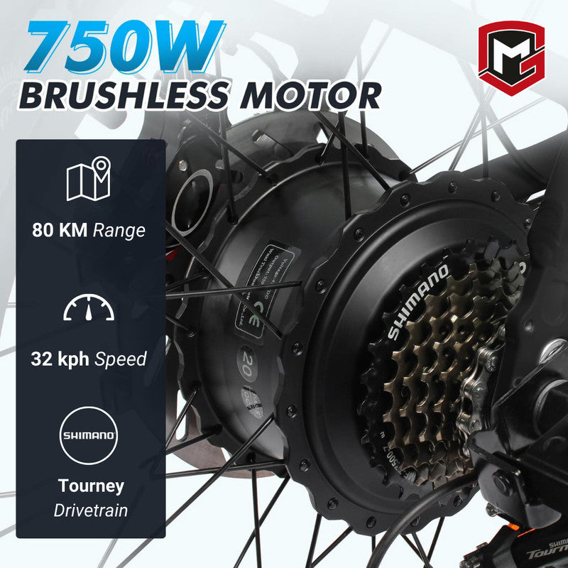 Built for adventure, the Mogoo Orion features a powerful 750W motor, 26"x4.0" CST fat tires, and a 48V/15AH removable battery for up to 60+ km of range. Its Shimano 7-speed drivetrain, alloy frame, and mechanical disc brakes deliver performance, control, and comfort across all terrains—whether rocky, sandy, or snowy.