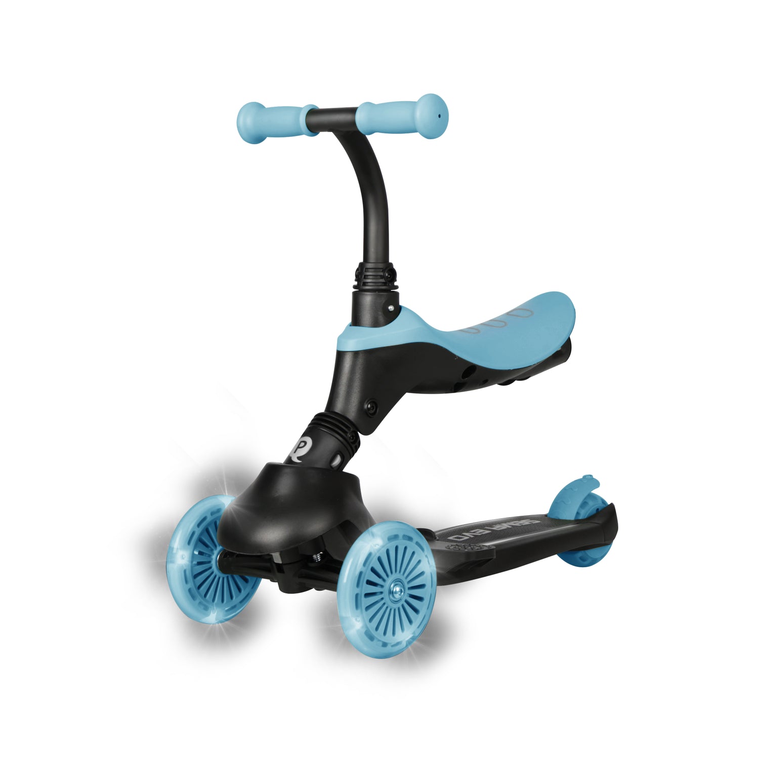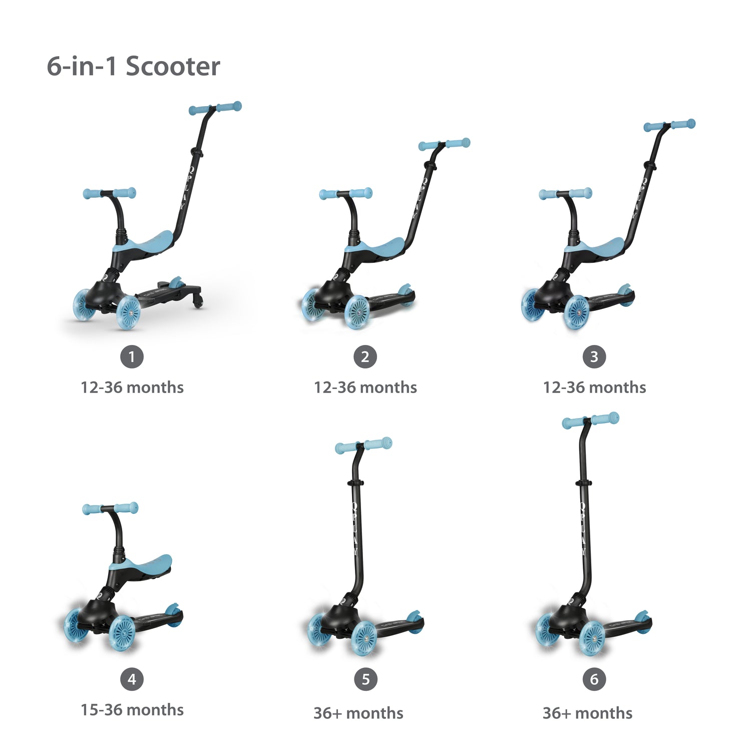The QPlay Sema Evo 5-in-1 Scooter is an innovative, multi-functional ride-on designed to support children's development from approximately 12 months up to 6+ years. It transforms easily through five modes, including a parent-controlled pushbike, seated ride-on, walking bike, and standing kick scooter. Built with a lightweight, foldable aluminum frame, it features motion-activated LED light-up wheels and deck for fun, battery-free visibility.
