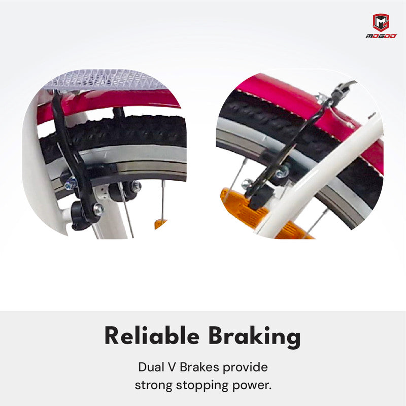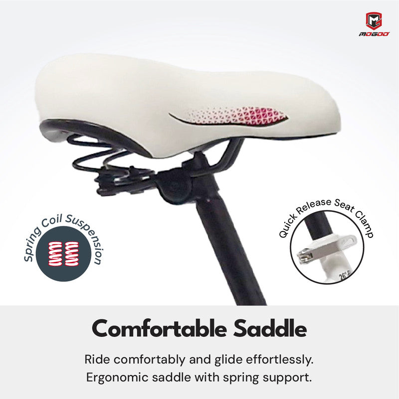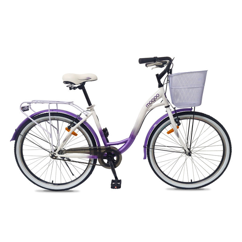 Experience the Mogoo Floress City Bike: a stylish and comfortable ride with a classic ladies' step-through steel frame. It features a simple 1-speed drivetrain, reliable V-brakes, and practical additions like a front basket, rear carrier, and mudguards. Enjoy a comfortable journey with its large spring saddle and retro-charming whitewall tires.