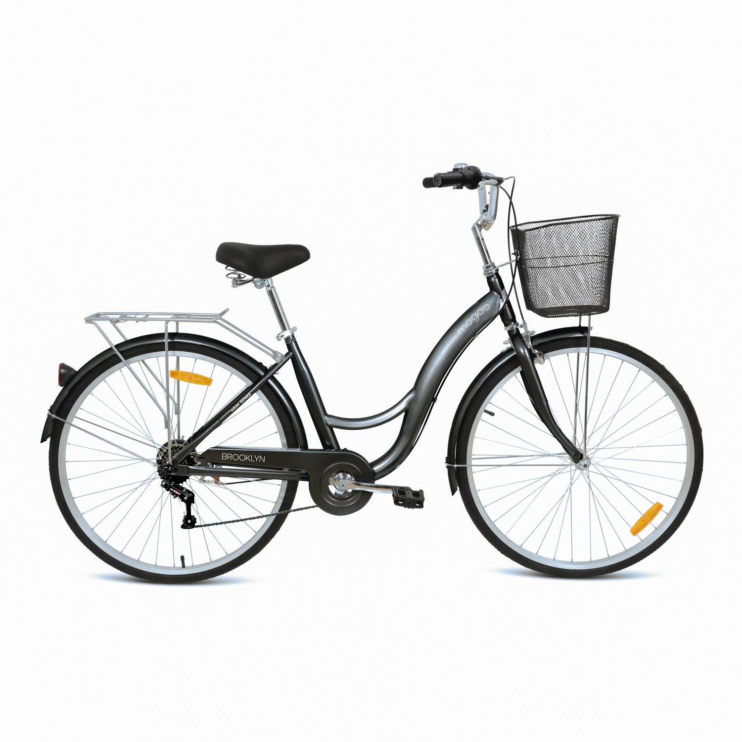 The Mogoo Brooklyn is a stylish and practical city bike, built with a durable steel frame and a low step-through design for easy use. It features a 6-speed gear system for smooth rides on any terrain, a wide padded saddle for comfort, and all-weather anti-skid tires for safe handling. With added conveniences like a front basket, rear carrier, and adjustable seat, it’s perfect for commuting, leisure rides, or everyday errands.