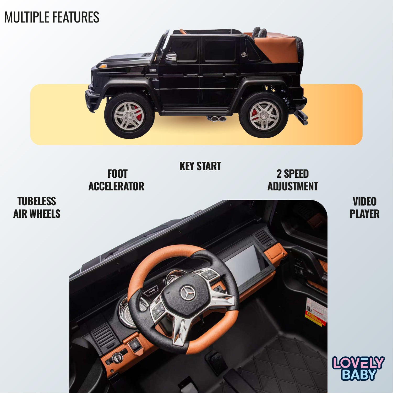 This Mercedes-Benz Luxury Ride-On Car is for kids aged 5-10 years, featuring a powerful 24V brushless motor and air rubber wheels for smooth rides. It includes dual speed settings, a foot accelerator, a leather seat, MP4 screen, music, LED lights, openable doors, and a large rear storage box for a premium, adventurous experience.