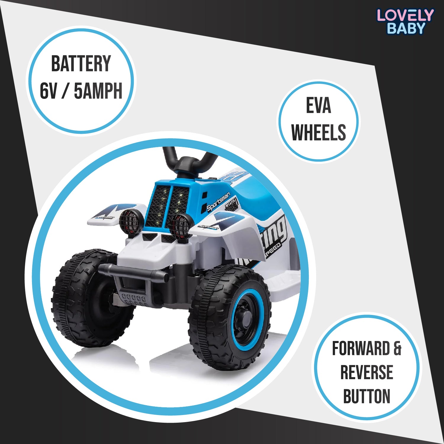 Get ready for adventure with the Lovely Baby S30 Sportsman Electric Ride-On Quad Bike! Perfect for toddlers aged 2-4 years, this 4-wheel motorcycle is powered by a 6V 5AMP battery for hours of fun. Its lightweight, safe design is ready for off-road exploration, with LED lights and a music option to make every ride a thrilling adventure.