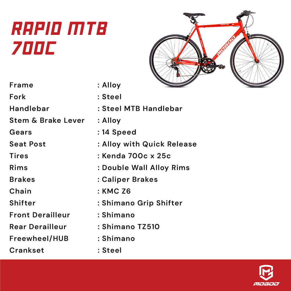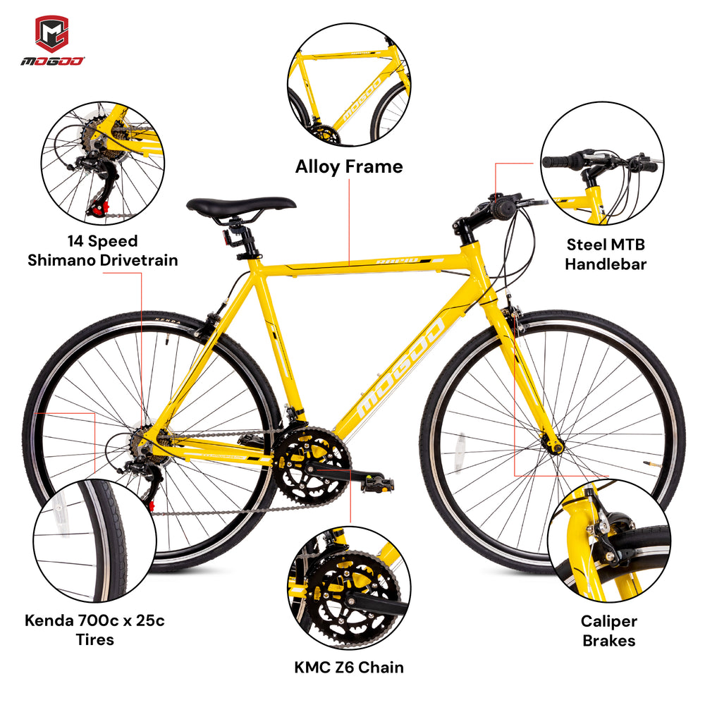 The Mogoo Rapid 700C Road Bike is a high-performance bicycle designed for speed, agility, and everyday riding. With a lightweight alloy frame, precision Shimano drivetrain, and aerodynamic features, it delivers a smooth, powerful, and responsive ride whether on the road or the track.
