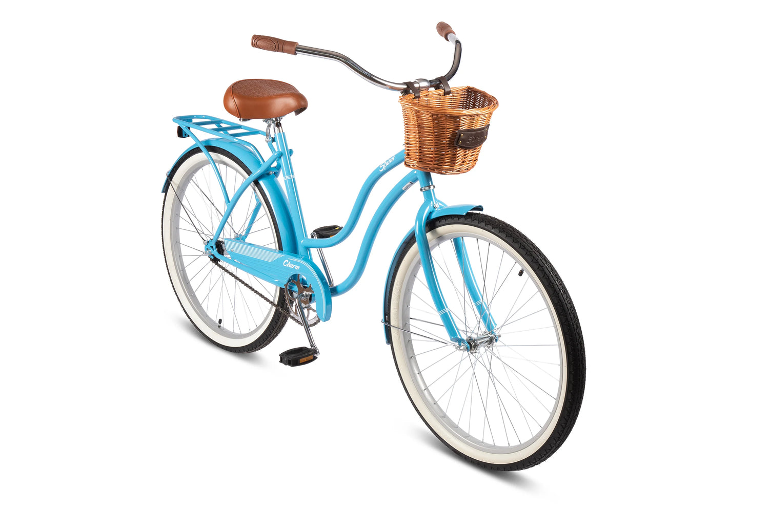 The Spinn Charm 26" Women's Cruiser Bike blends style, comfort, and functionality in a beautifully designed ride. With its elegant frame, woven basket, and wide saddle, it's perfect for relaxed rides around town. A sturdy steel frame, single-speed simplicity, and reliable disc brakes make it as practical as it is pretty.