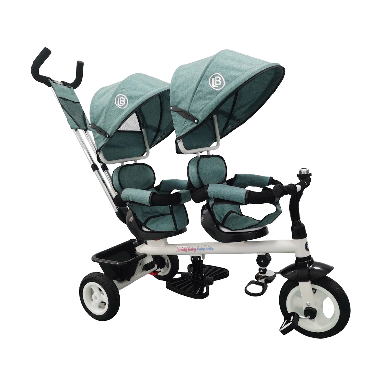 This Lovely Baby 2-Seater Trike is ideal for toddlers aged 1-3 years. It features a 360° rotating twin seat, smooth rubber wheels, and a parent turning handle for easy navigation. Plus, enjoy added comfort with a sun canopy, safety bell, and rear storage.
