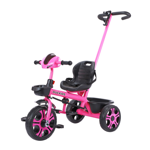 This Lovely Baby Duckids Tricycle provides a fun, secure, and adaptable ride. It features a steering push handle for parents, a sturdy steel frame with a seatbelt for safety, and LED lights with music to entertain kids. Plus, baskets and a bottle holder add practical convenience.