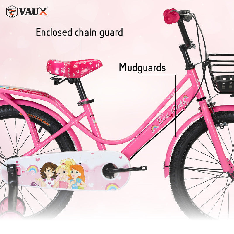 Vaux Eva Girls' Bicycle - Style and safety for the young rider! Crafted with a durable steel frame, this bicycle is available in multiple sizes to grow with your child. The bike comes with a front basket for carrying essentials and a rear seat for added flair and functionality.