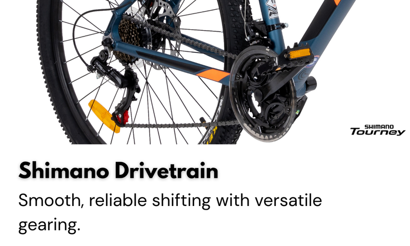- 21-speed Shimano drivetrain for smooth gear shifts.