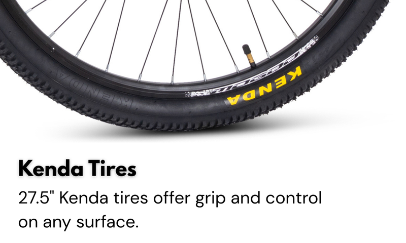 - 27.5" Kenda tires with double-wall rims for grip and durability.